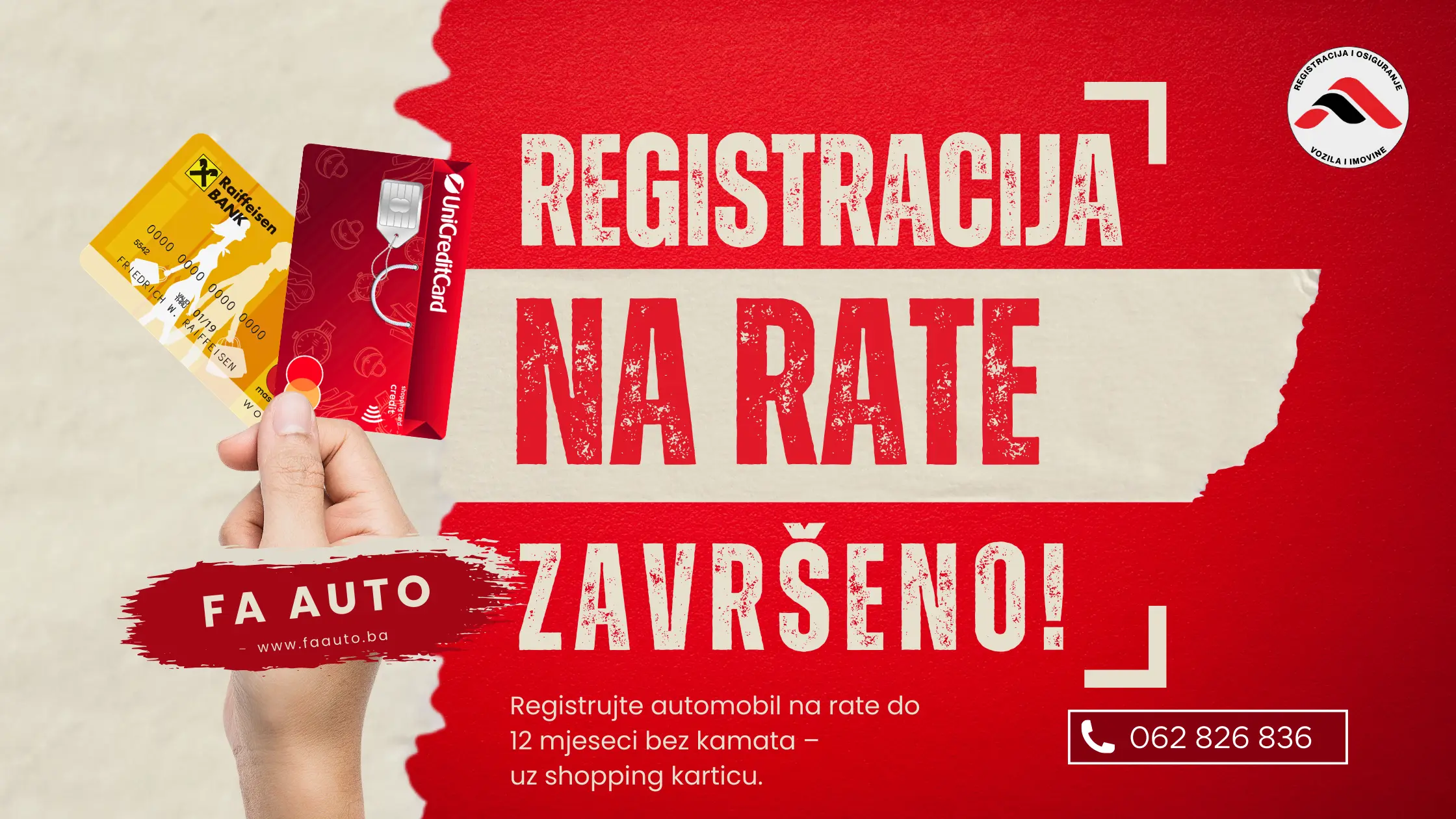 Ako želite registrovati vozilo bez opterećenja budžeta, FA Auto vam omogućava plaćanje do 12 mjeseci bez kamate putem shopping kartica Raiffeisen i UniCredit banke.